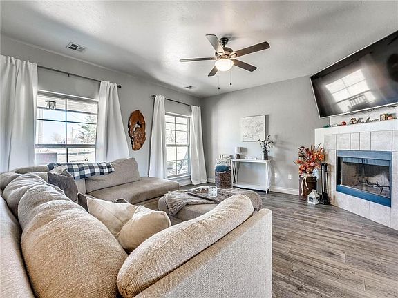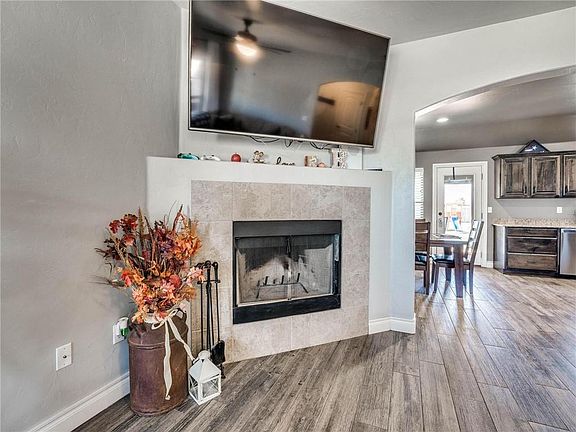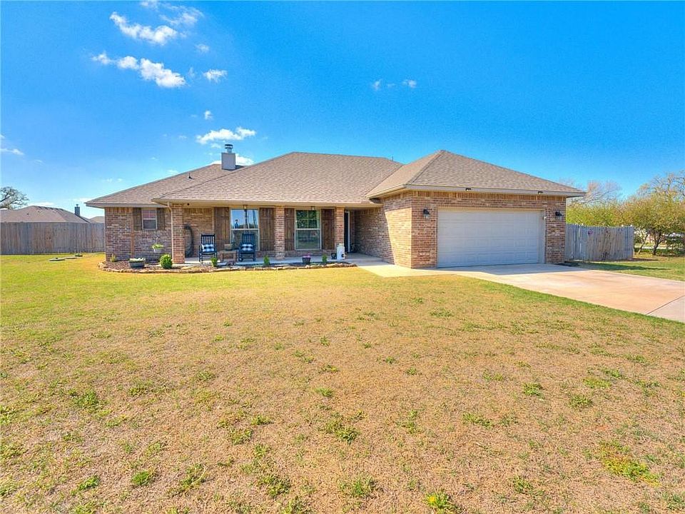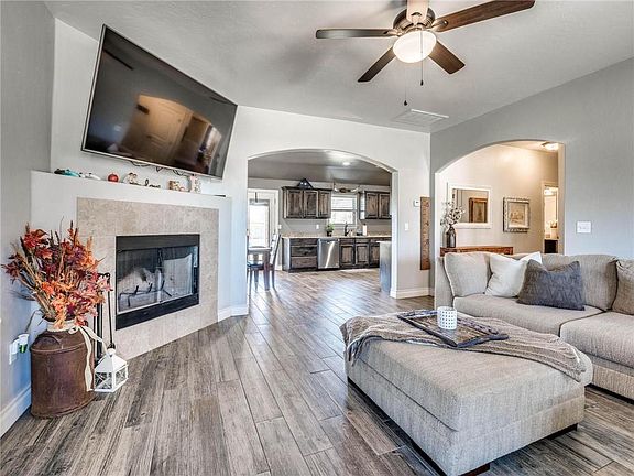 Charming home in mint condition! Great home featuring an open plan with nicet flow! Gorgeous wood look tile flooring! Excellent living space with loads of room around a cozy fireplace! Front porch that opens to nature and is ready for morning coffee in wide open space! The kitchen features a beautiful high ceiling and has loads of storage. Large primary bedroom is located off the living and kitchen and is separated from the secondary bedrooms and features a well appointed ensuite bath and nice sized closet. This plan wastes no space and the secondary bedrooms are well sized with nice closets. This home is perfect for young families or owners wishing to downsize. Nearly one acre of fully fenced yard can be used in an untold number of ways! Award winning Edmond schools with low taxes and no HOA! Raise your chickens or just enjoy the great space - so much to offer. It is immaculate and special.
