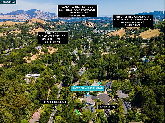 Visit https://www.3402goyakdrive.com for a full video tour and more photos! Welcome to 3402 Goyak Drive, a rare offering in Lafayette’s coveted Springhill neighborhood. This beautifully renovated 4-bedroom, 3-bathroom single-story home is tucked at the end of a quiet cul-de-sac on nearly an acre, surrounded by rolling hills and mature trees for ultimate privacy and serenity. Renovated by Woehrle Real Estate & Development—featuring refinished hardwood floors, updated bathrooms, new lighting, fresh paint, lush landscaping, and a recently remodeled kitchen with high-end finishes and fixtures that blend style with everyday function. With dual access from both Goyak Drive and Springhill Road, the lot qualifies under SB9 for a potential lot split—offering the opportunity to build a second home and ADU or sell the new parcel, which could be worth $500,000 or more. Whether you're looking to expand, invest, or simply enjoy a turnkey home in a prime location, this property delivers. Enjoy direct backyard access to top-rated Springhill Elementary and Acalanes High School, Springbrook Pool, and miles of scenic Briones trails. This is more than just a home—it’s a lifestyle, a legacy, and a smart long-term investment in one of Lafayette’s most sought-after communities.
