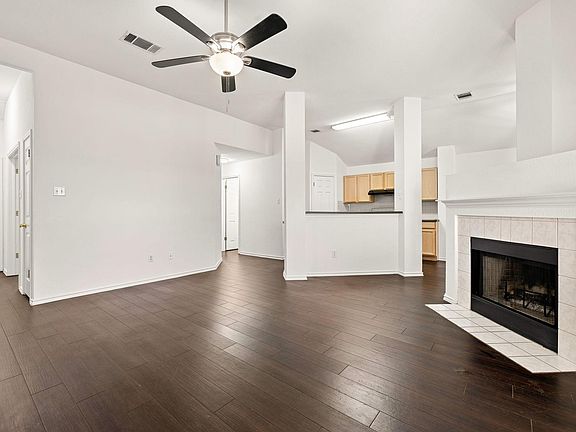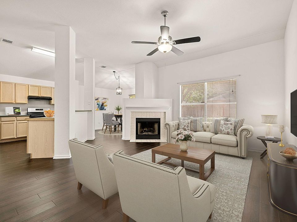 Inviting woodburning fireplaceIndoor utilitiesHigh ceilingsTwo-car garageClean interior paintSpacious primary suiteGenerous fenced backyard