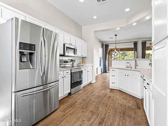 Premium North/South facing home on a private corner lot. Don't miss the opportunity to own this charming 3 bedroom, 2 bath home with substantial updates. A custom iron door leads you to an open floor plan with elevated ceiling height and an abundance of natural sunlight. A functional floor plan that includes a kitchen nook, a secondary dining area connected to the great room with an inviting gas fireplace. The outdoor living space offers unparalled privacy and tranquility. The manicured desert landscape is designed for relaxation and entertaining. The view fence backs up to a wash, creating plenty of space between homes. Catch the trail to the right of the house to head to the community parks or to Sunset Ridge Elementary and Middle School. Opportunity is waiting for you to take advantage of the assumable 3.25% loan, low cost HOA with zero rental restrictions. A perfect lock and leave, located near TSMC, Ben Avery and I-17. Plenty of shopping, restaurants and trails to catch a hike.