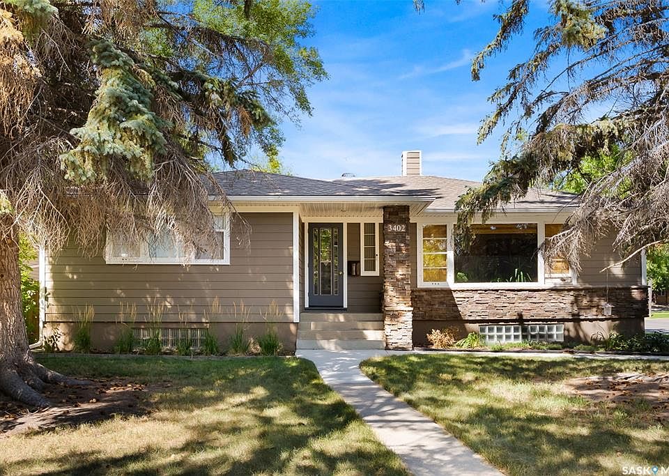 Welcome to 3402 Westgate Avenue, a beautifully updated 1,488 sq ft bungalow located in Lakeview, one of Regina’s most sought after neighbourhoods. Situated on a mature, tree lined corner lot, this home offers the perfect blend of character, charm, and modern updates and is located just minutes from Wascana Lake, downtown, and all south end amenities. Step inside to an inviting open concept main floor featuring large windows and great sight-lines throughout the living, dining, and kitchen spaces. Original hardwood floors, original wood doors, and trim reflect the home’s timeless character, while tasteful upgrades bring a fresh, modern feel. The white kitchen is a showstopper, boasting quartz countertops, a centre island, stainless steel appliances, high end cabinetry with built-in spice rack and appliance garage—all designed for functionality and style. The dining area comfortably fits a large table, making it ideal for hosting family and friends. Down the hall, you’ll find three spacious main floor bedrooms with ample closet space and a 4 piece bathroom to complete the level. The fully finished basement offers even more living space with a large, bright family room, fourth bedroom, 3 piece bathroom, dedicated workout room, cold storage, laundry, and additional storage area. Making this home a perfect choice for growing families. Outside you can enjoy your private backyard space with a large low profile deck, fire pit area, large storage shed, and great fenced yard. The double detached garage is heated and insulated, with new garage doors and lane access. Additional exterior highlights include new Hardieboard siding and stone features, new shingles, upgraded electrical panel, new driveway, and newer fencing. The all reflecting true pride of ownership. Located in a friendly, walkable neighbourhood with access to top rated schools, parks, and local amenities, this home reflex true pride in ownership, and is move in ready for its next family.
