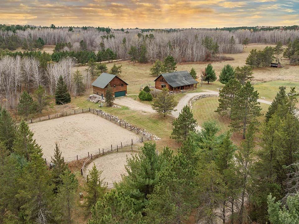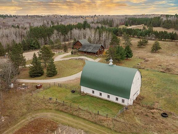 This well-built log home sits on over 10 beautiful acres bordering hundreds of acres of public land ideal for trail riding and hunting. A covered porch welcomes you into the open floor plan featuring vaulted ceilings, a kitchen with custom maple cabinets, stainless steel appliances, granite countertops, and a maple butcher block island. The cozy living room offers a gas fireplace, office nook, and ample storage. The main-level primary bedroom includes a walk-through bath with a jetted tub and tile shower, while log stairs lead to a loft bedroom with a private deck overlooking the pasture and barn. The lower level includes a bedroom, full bath, living area with epoxy floors, laundry, utility room, and private library. The detached garage is split into a heated two-stall section and a single-stall area with stairs to a two-bedroom plus loft apartment. Perfect for a hobby farm, the property includes 10 oak stalls, a tack room, blacksmith shop, hay storage, and a newer steel roof. The land is partially fenced with separate sections, its own well for two self-watering stations, an arena, training area, open pasture, wooded riding trails, and direct access to hundreds of acres of public land for recreation or hunting. The property is conveniently located just 10 minutes from Hackensack and near the Crystal Lake public access—one of central Minnesota’s clearest lakes with excellent swimming. Bring your outdoor toys, horses and farm animals and make this awesome property home!