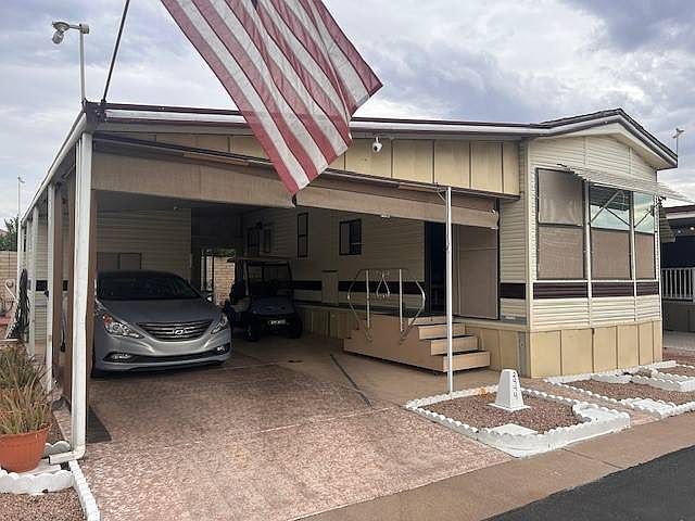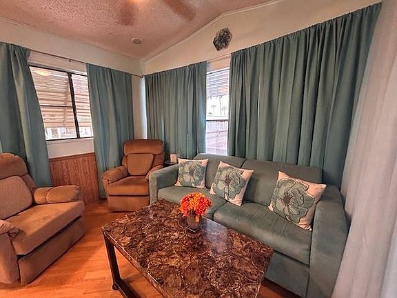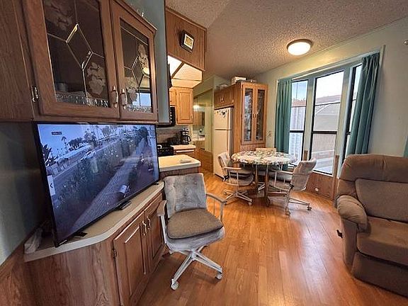 Lots of upgrades in this beautiful park model. Located On East Wall Newer 2 1/2 Ton A/C (2024), Newer Roof (2024), New Water Heater, Vaulted Ceilings, Updated Laminate Flooring, Built in Microwave, Newer Smooth Top Stove, Tub/Shower Combo, Large Carport W/ Pull Down Sunscreens, Shed - 2 Work Benches, Full Size Washer/Dryer, Glass Slider W/Screen To Back Patio, Large Back Patio W/Pavers, Security System W/ 8 HD Motion/Heat Sensor Cameras, Fully Furnished, Lifestyle Fees Paid Until Jan 2026
