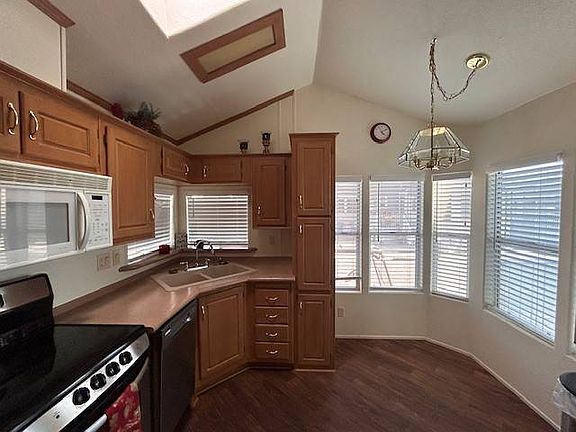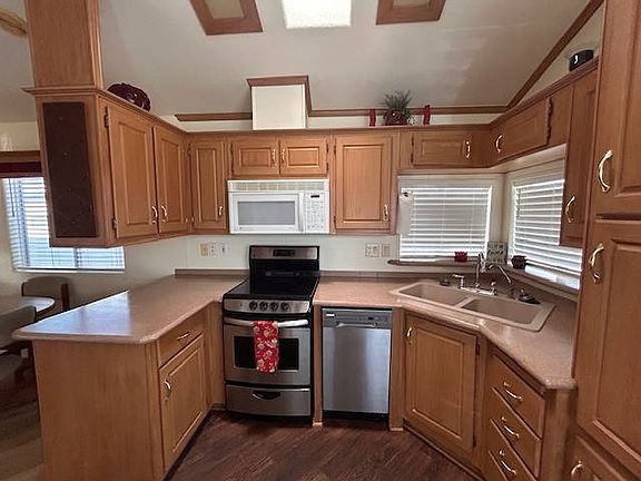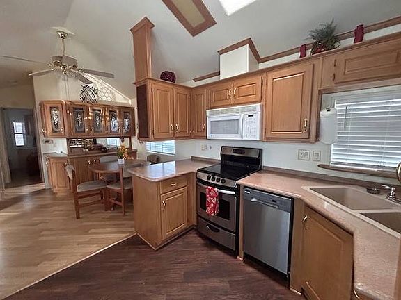 Move in ready, includes Golf Cart, front kitchen & breakfast nook, garbage disposal, dishwasher, updated counter tops, 2nd large dining area, Skylight, ceiling fans, separate laundry room w/washer & dryer, Queen size bedroom, big Arizona room w/ 2nd full bath, fully furnished, La-Z-Boy pullout sofa & two recliners, wood laminate flooring, tiled foyer, large front porch w/ BBQ, security screen door.
