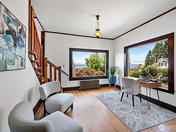 Perched on a corner lot in the highly desirable Sunset Hill neighborhood, this adorable Craftsman radiates warmth & charm. Exposed beams, rich woodwork & views of the Puget Sound greet you upon entrance. Refreshed in 2004, this home mingles original character & modern luxury with updated electrical, copper plumbing, earthquake retrofit, kitchen, primary suite/ADU, finished attic & unparalleled views of the Sound & Olympics. Breakfast nook and covered deck with views? Check. Huge Shop offers untapped potential. The garden? Pure magic. Lush & intentional. This elegant Craftsman is a reminder that homes like this just aren't built anymore. Near top-rated schools and everything you love about Ballard. Parks, markets, & all your favorite spots.