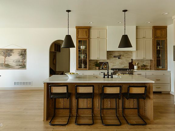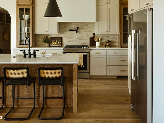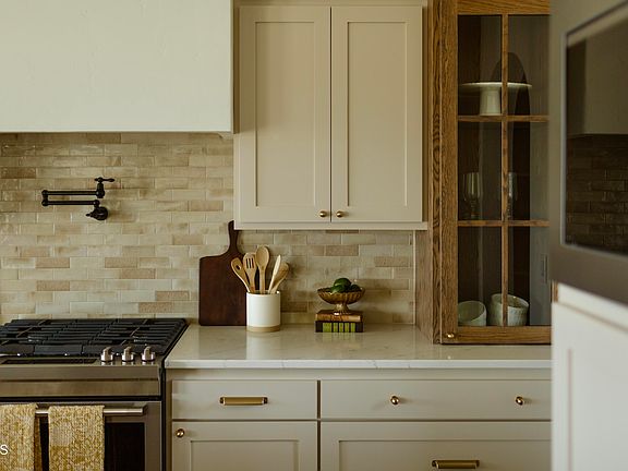Natural stone gas fireplaceTile backsplashQuartz countertopsPot fillerSpacious officeCustom hood and cabinetsLarge walk-in pantry