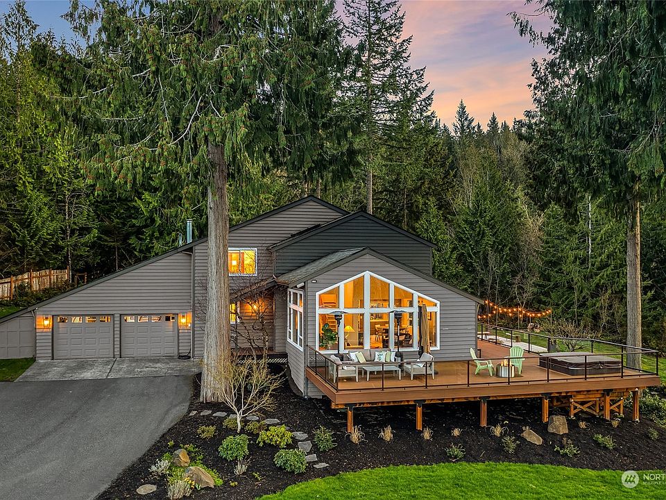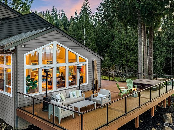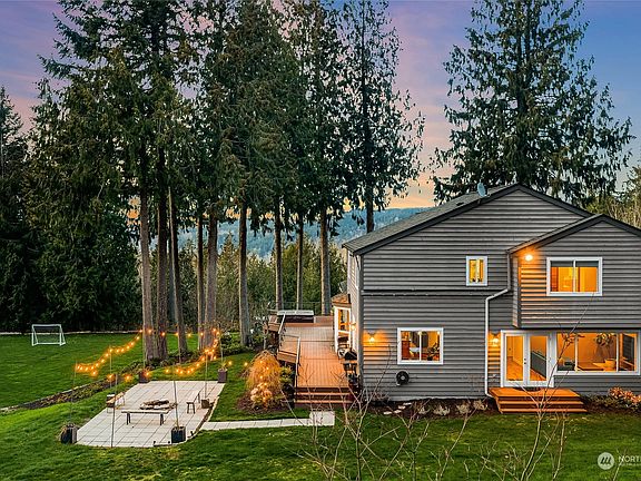 Nestled beyond a gated entry, discover the ultimate hilltop retreat on 5 lush acres. Savor the enchanting landscape and Cascade Mtn. view from the expansive wrap-around deck. A 2-story entry leads to radiant living spaces with walls of windows overlooking the picturesque grounds. The epicurean kitchen seamlessly flows onto the deck, creating an indoor-outdoor living experience that is effortless and enjoyable. Flagstone paths lead to generous fully-fenced green space, outdoor firepit, nature trail and babbling creek. All new exterior paint and equestrian potential with 2-stall pole barn, RV/boat parking, 2-car garage with shop and ample storage. Just minutes to the Preston-Snoqualmie Trail, downtown Fall City and endless outdoor recreation.