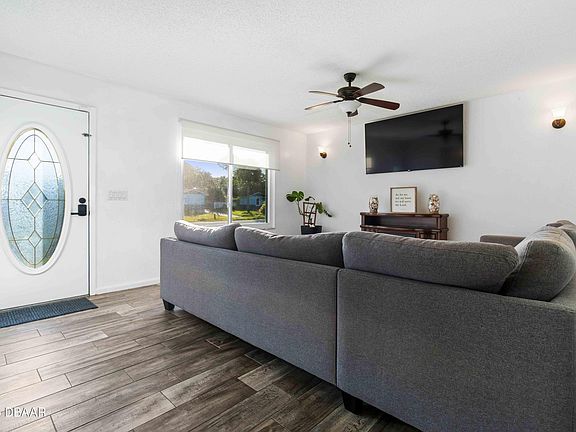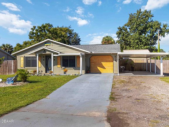 Welcome to this beautifully updated home in the sought-after Florida Shores community of Edgewater. Offering 3 bedrooms plus a converted garage that can serve as a 4th bedroom or flexible living space, and 2 full bathrooms, this 1,316 sq ft residence is filled with thoughtful upgrades inside and out. The open floorplan is filled with natural light, with the living room and kitchen seamlessly connected. The kitchen showcases a stunning center island, new appliances, and plenty of cabinetry and counter space for cooking and entertaining. Throughout the home, stylish barn doors add charm and character. The spacious primary suite features a private sliding glass door that opens to an enclosed Florida room, perfect for a home office, hobby space, or additional lounge area. The en suite bath offers a walk-in shower for convenience. Recent updates include a new 6-ft wooden fence, solar panels, new water softener, ADT security system, whole-home surge protection, generator plug, and RV plug. A carport with RV hookup adds even more functionality. Step outside to enjoy the large, fenced backyard with lush landscapingideal for relaxing or gatherings. Located just minutes from popular beaches, shopping, dining, and more, this property offers both comfort and convenience in a vibrant coastal setting. Mortgage savings may be available for buyers of this listing.