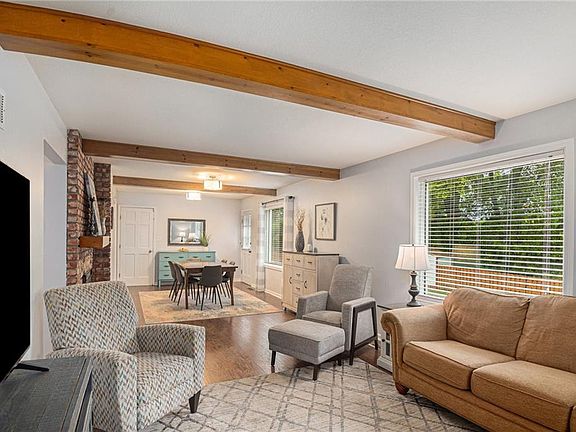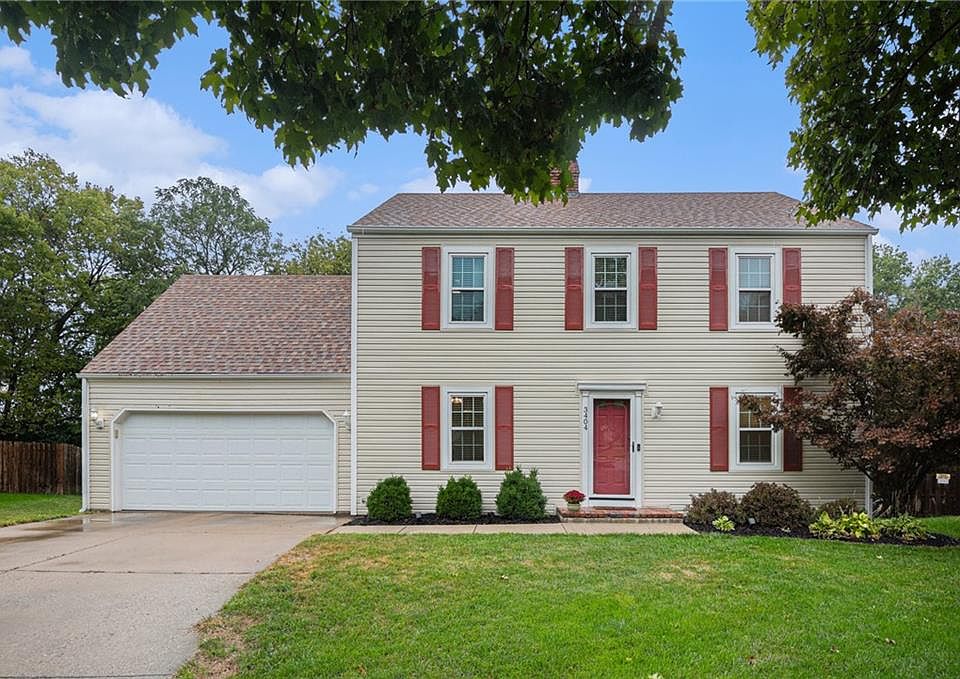 Move-In Ready 2-Story Home at the End of a Quiet Cul-de-Sac! Step into a charming entryway that opens to an updated kitchen featuring granite countertops, a center island, pantry, decorative backsplash, stainless steel appliances, and a double oven. The spacious dining and living rooms are perfect for entertaining, highlighted by a stunning fireplace with a custom mantle and exposed ceiling beams. A remodeled powder room on the main level offers modern wallpaper and a new vanity. Also on the main floor is a versatile bedroom—ideal as a guest room, playroom, or home office. Upstairs, the inviting primary suite boasts two walk-in closets and a beautifully remodeled bathroom with a new double vanity, patterned tile flooring, a walk-in tiled shower, and a skylight. Two additional spacious bedrooms also include walk-in closets, ceiling fans, and carpet. The updated hall bathroom features modern patterned tile, a double vanity, and a tiled shower/tub combo. The finished basement expands your living space with a cozy family room, fireplace, workout area, storage room, half bath, and more. Enjoy the fully fenced backyard—perfect for relaxing or entertaining- backing to mature trees and shed. This low-maintenance home includes vinyl siding, updated vinyl windows, and a new air conditioner. Centrally located near shopping, dining, Happy Rock Park, and more—this home has it all!