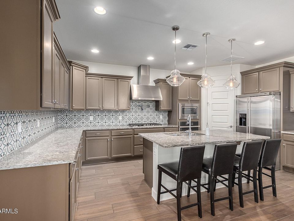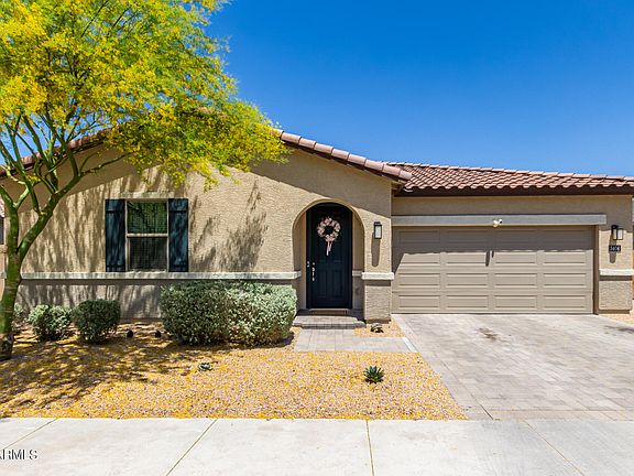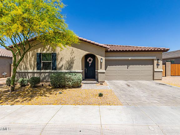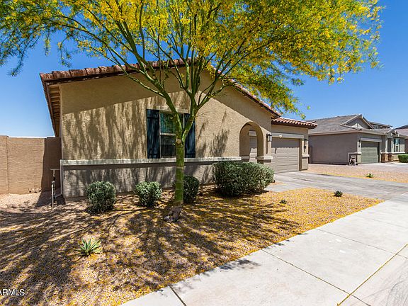 Introducing this adorable 4-bedroom home in Santolina South Mountain Community! Featuring a 3-car tandem garage with attached cabinets, RV gate, and mature landscape. Inside, an inviting hallway leads to the bright & large open floor plan paired with wood-look tile flooring, neutral paint, and sliding glass doors to the back patio. Impeccable kitchen displays recessed & pendant lighting, stylish tile backsplash, a pantry, stainless steel appliances, ample cabinetry with crown moulding, granite counters, and a practical island with a breakfast bar. You'll love the serene primary retreat equipped with plush carpet, walk-in closets, and an ensuite with dual sinks. Spacious backyard has a covered patio, perfect for unwinding after an exhausting day. Don't miss out on this amazing abode!
