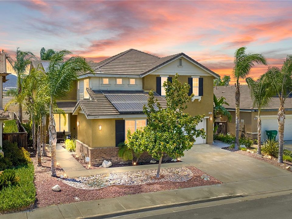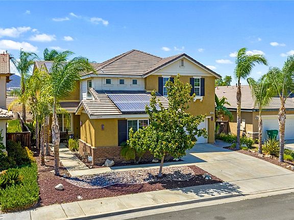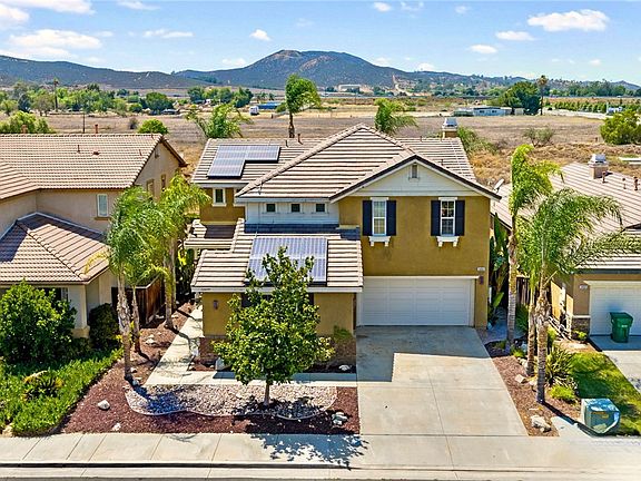 Welcome to this spacious 5-bedroom Murrieta home, thoughtfully designed for comfort, functionality, and multigenerational living. The main level offers a junior suite or primary bedroom with a walk-in shower and closet—ideal for extended family or guests—plus a convenient half bath for visitors. Enjoy both formal and informal dining and living areas, perfect for entertaining or everyday gatherings. The kitchen features granite countertops, a walk-in pantry, abundant storage, and a built-in desk—perfect for homework or a home office. Upstairs, a cozy loft greets you at the landing, leading to two bedrooms that share a hallway bath, another junior suite with its own bath, and the primary retreat. The spacious primary bedroom boasts wood-like tile flooring (no carpet), a soaking tub, and a generous walk-in closet. An upstairs laundry room with a sink and ample hallway storage adds everyday convenience. The backyard is a private oasis with no rear neighbors, a covered patio, a fire pit, lush grass, and mature palm trees—perfect for enjoying both sunsets and sunrises. A 3-car garage offers plenty of space, and solar is to be assumed by the buyer. Ideally located near Loma Linda University Medical Center, Kaiser Permanente, and the 215 Freeway, this home offers easy access to major destinations. Shopping is a breeze with Costco on Clinton Keith, Target, and numerous other retail centers just minutes away, giving you several convenient options for dining, groceries, and entertainment. With beautiful curb appeal, a large lot, and a floor plan that blends style and practicality, this home is a true Murrieta gem.