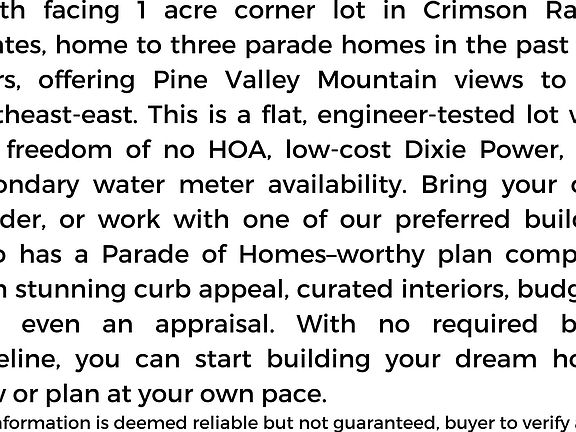 South facing 1 acre corner lot in Crimson Ranch Estates, home to three parade homes in the past two years, offering Pine Valley Mountain views to the northeast-east. This is a flat, engineer-tested lot with the freedom of no HOA, low-cost Dixie Power, and secondary water meter availability. Bring your own builder, or work with one of our preferred builders who has a Parade of Homes-worthy plan complete with stunning curb appeal, curated interiors, budgets, and even an appraisal. With no required build timeline, you can start building your dream home now or plan at your own pace. All information is deemed reliable but not guaranteed, buyer to verify all.