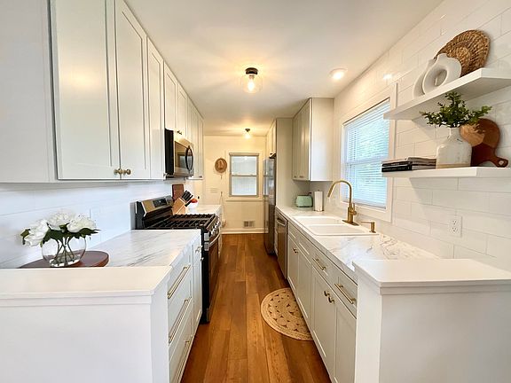 This gorgeous remodeled home has just been freshly painted inside and out and offers all new interior doors and trim plus beautiful refinished hardwood flooring throughout. The galley style kitchen is stunningly outfitted with soft gray shaker style cabinetry, new countertops, ceramic tile backsplash, champagne gold hardware and all new stainless steel appliances. There are two wood burning fireplaces, one in the main floor living room and one in the lower level family room. The breezeway/3 seasons porch provides access to the deck and large fenced in backyard, as well as the attached garage. (New central air in 2024, new pad & carpet in the basement in 2024, water heater 2021, furnace 2015, newer roof as well as newer vinyl replacement windows.)