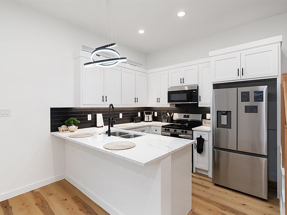 Outside, the home stands out with its clean white stucco façade and sleek copper gutters that add a modern touch of elegance. A fully fenced backyard offers a private space for outdoor dining, gatherings, or simply unwinding after a day exploring town.