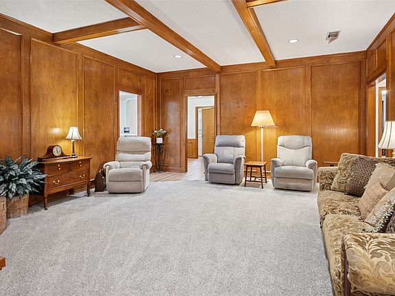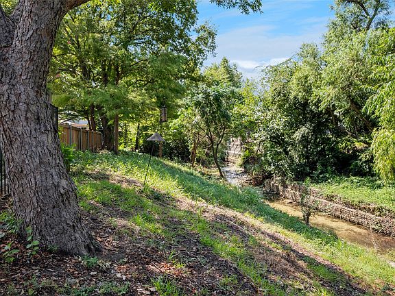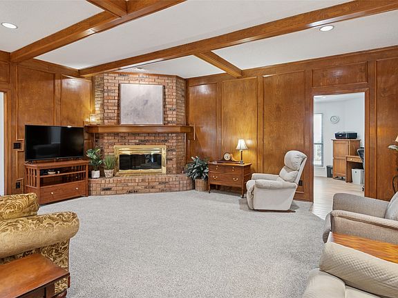 The living room features a handsome beamed ceiling and a corner wood burning fireplace with floor-to-ceiling brick, creating a warm, inviting space—perfect for cozy evenings or Monday night football. At the back of the home, a skylit bonus room offers tranquil views of the tree-lined creek. This versatile space works beautifully as a playroom, homeschool area, billiards room, hobby studio, or home based office.