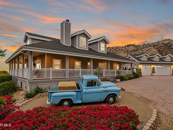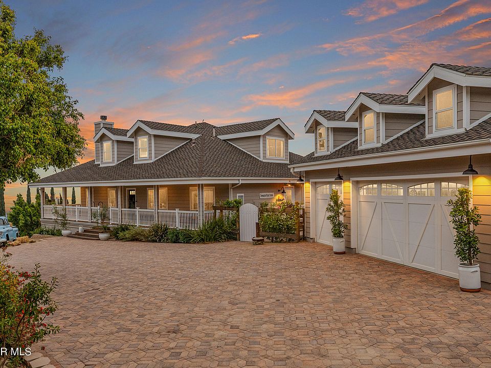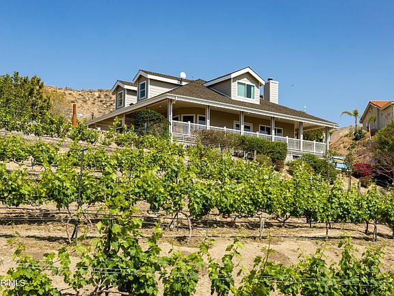 This exquisite modern farmhouse is situated on 2.4 acres with a beautiful vineyard and panoramic mountain views. A country road entrance lined with pepper trees evokes feelings of being farther away than just outside the city limits. Views from the wraparound porch overlook the Zinfandel and Cabernet grapevines, and there is plenty of space for gathering and entertaining outdoors with decomposed granite installed in the back and side yards, all tastefully lit with custom outdoor lighting. An open floorplan allows for plenty of natural light and takes advantage of the views from every vantage point. Newly installed luxury vinyl tile flooring and updated millwork accent the windows and complement the French doors leading out to the porch. Recently featured in 805 Living magazine, the new kitchen design displays Brookhaven cabinets by Wood-Mode, butcher block from Wood Welded West, fixtures by California Faucets, undercabinet lighting, Caesarstone countertops, GE Monogram appliances, a Zephyr range hood, Kichler light fixtures, and a Shaws Fireclay apron sink. Other updates include a newly painted interior, recessed porch lighting, and ceiling fans. Take comfort in the independence of a fully owned solar power system (Solar World 300-watt panels/7000-watt system) designed for additional panels such as one for an electric vehicle, and enjoy additional self-sufficiency with chickens and eggs in a sophisticated coop with lights, misters, temperature control options, and access for ease of cleaning. Whether used for a workshop or for parking, there is ample storage in the 3-car garage and use of the toy hauler area. With all of these features and a convenient location near city amenities, this property offers a unique experience for those looking for something different.