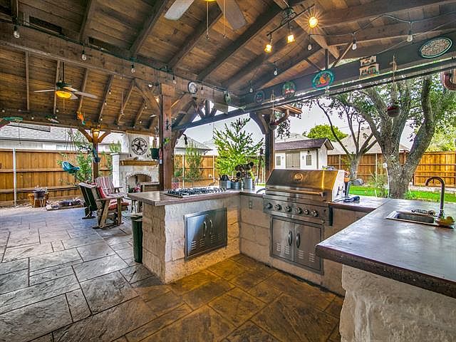 Beautiful home desirable subdivision with amazing backyard features, great curb appeal with stained concrete walk way, putting greens and front porch pergola, engineered hardwood floors in formals and bedrooms, marble tiles in kitchen, ceramic tiles in bathrooms, wetbar with fridge and sink, crown molding, gas log fireplace, chef's kitchen with granite, stainless steel appliances, undermount sink, breakfast bar, gas cooktop, venthood, double oven, computer nook, over-sized master, dual sinks, jetted tub walk-in closet, backyard oasis with full-size outdoor kitchen with built-in grill, cooktop, and sink, over-sized pergola, woodburning fireplace, soft turf glass, sliding gate, storage building.