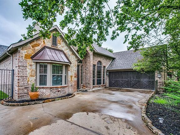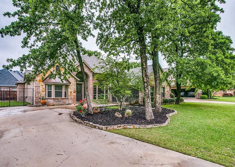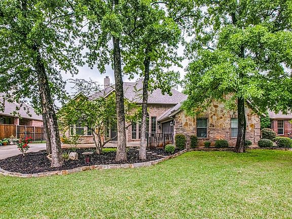 Beautiful custom stone and brick 2004 home with only media room up, handscraped hardwood floors, dog run, and mature trees on lot. Open kitchen features brick archway to living room, granite counters, SS appliances, and custom cabinets and leads to breakfast room with bay windows. Enjoy in-home entertainment in the media room with wet bar and vaulted ceiling. Master suite with tray ceiling and walk in shower, garden tub, dual vanities and sinks, and granite throughout. Gorgeous custom stone patio covered with pergola perfect for outdoor entertaining!