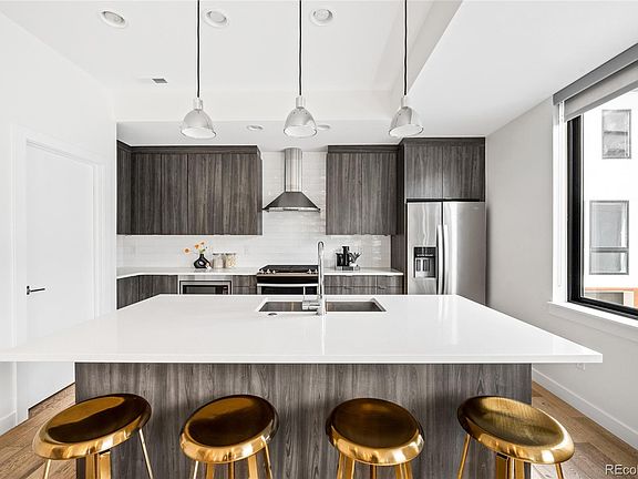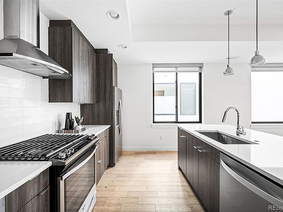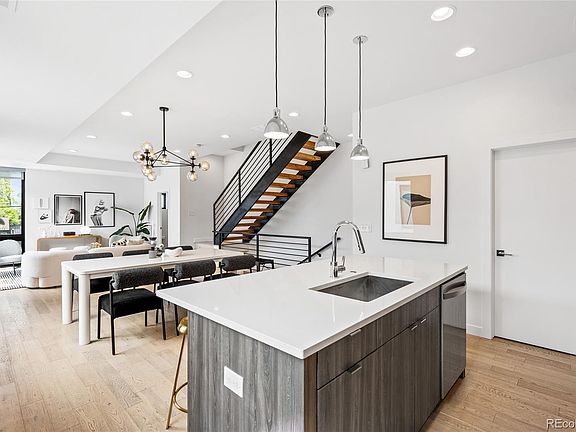 Multi-level Townhome 4 Blocks from Sloan’s Lake | Large Rooftop Patio Overlooking Downtown & Mile High Stadium | 2 Car Garage | Freshly Painted Interior | Open Concept Living Area w/ Large Windows | 12’ High Ceilings | White Oak Flooring | Upgraded Light Fixtures | Custom Steel & Pine Staircase | Main Floor Powder Room | Multiple Storage Closets | Clean-Line Kitchen w/ Sleek Modern Cabinetry | Quartz Countertops | Large Pantry | Stainless Steel Appliances | Gas Range | Large Primary Suite w/ Walk-In Closet | EnSuite w/ Glass Enclosed Shower | Bedroom-Adjacent Laundry Closet | Large Secondary Bedroom w/ Dedicated Bathroom | Entry Level Office or 3rd Bedroom | Street-Facing End Unit | Nest Thermostat