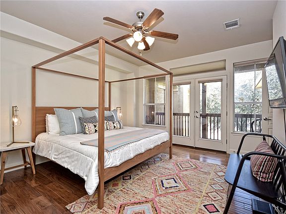 Private, gated community in the heart of 78704! Wonderfully open and bright floorplan with hand scraped wood and tile flooring. Kitchen features stainless appliances, breakfast bar, walk-in pantry, an abundance of storage and opens to the living. Up the stairs you land on a second living space separating the en suite bedrooms. The master bedroom is massive with a tub and separate shower and has beautiful French doors that lead to a private balcony overlooking the cozy, privately enclosed courtyard. 2 fireplaces for the cool nights, one wood burning outdoors and a gas one in the living that is on a switch. Wonderfully luxurious lock and leave condo walking distance to all the very cool shops, restaurants and entertainment on S Lamar and only minutes to Downtown and Zilker Park.