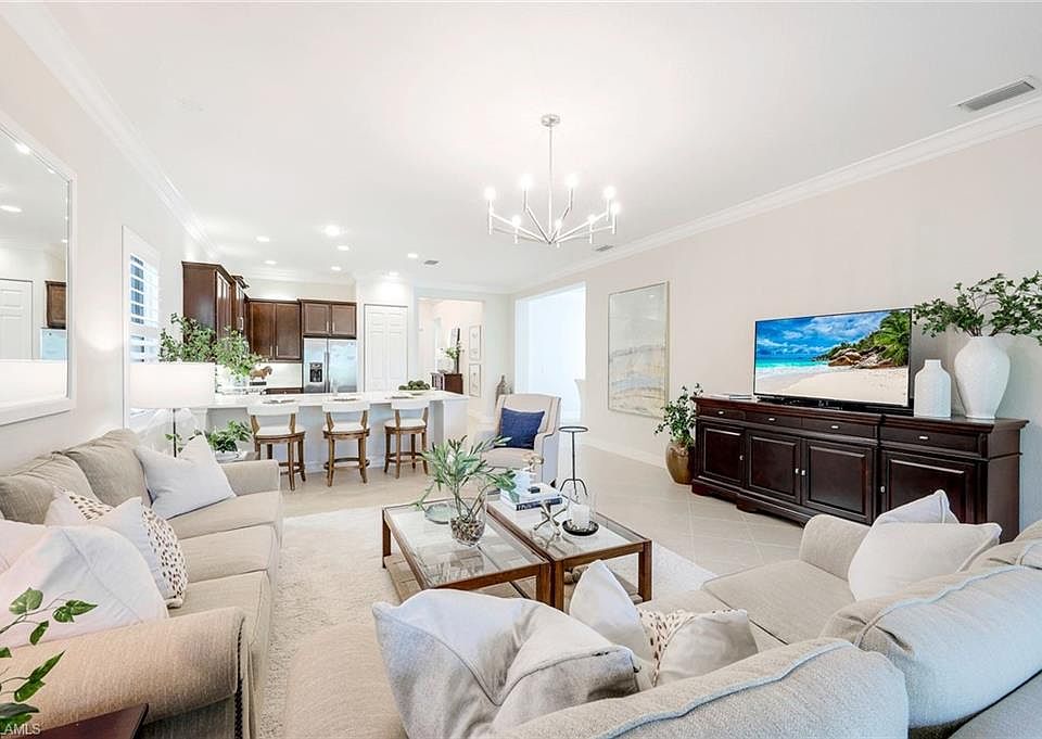 This impressive "Tribeca" floorplan home offers 3 Bedrooms+Den, 2.5 Baths, 2 car garage and is situated overlooking a private and tranquil preserve. Southern exposure and a 12' sliding glass door to the lanai make this home light & bright! An open great room style floorplan with separate dining room make this the perfect home for entertaining. A long list of special features include: HURRICANE IMPACT WINDOWS/DOORS; NEW wood flooring in the bedrooms & den; NEW Calcutta quartz countertops in the kitchen & master bath; fresh interior paint; NEW light fixtures; plantation shutters throughout; 7" crown molding; diagonal tile throughout the common areas; finished garage floor; upgraded paver driveway; fenced backyard; & more! Furniture/Decor available! Riverstone is North Naples Hottest Development offering incredible Amenities and Location. The Clubhouse offers a full gym, Indoor/outdoor Basketball Court, Resort Style Pool, Lap Pool, Kiddie Water Park, Playground, 5 Tennis Courts, Billiards Room, Social Hall, Game Room, and more! Located just 5 min to I75, 15 min to the Beach/Mercato/RSW & 25 min to Downtown Naples. A Rated Schools: Laurel Oak Elem, Oakridge Middle, Aubrey Rogers HS.