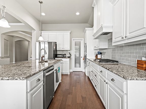 Stunning 4 bedroom, 2.5 bath single story home boasting quality craftsmanship featuring gorgeous Engineered hardwood floors throughout the main living areas, updated lighting, & crown molding to name a few. The moment you step into the Custom 8' front door you will see how loved & cared for this home has been with an open floor plan that is an Entertainer's dream. Picture yourself cooking for friends & family in the Gourmet kitchen complete w granite countertops, SS appliances, recently upgraded Pantry door, large island w breakfast bar opening up to the family room. Cozy up to the gas log FP, perfect for enjoying the cooler weather. Restful Primary Bedroom includes separate vanities, garden tub, separate shower & huge WIC. Spacious secondary bedrooms share the guest bath or there is a half bath available as well. Relax out back under the covered patio overlooking the private backyard, w no neighbors behind you. Amenities include a community pool, several playgrounds & walking trails.