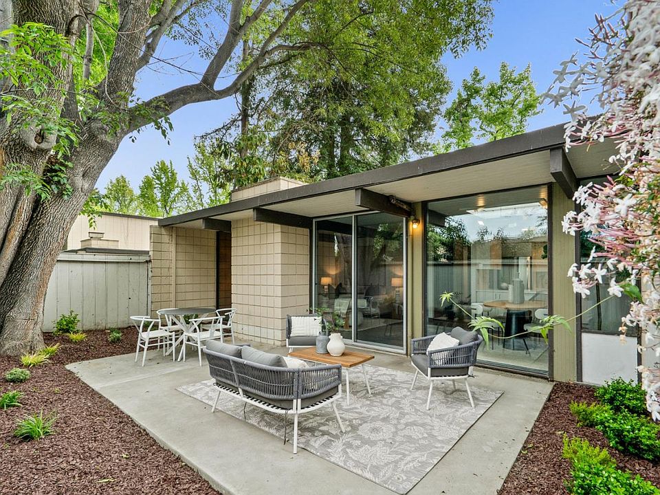 Tucked into a quiet corner of the desirable Pomeroy West community, this thoughtfully updated single-story Eichler townhome blends iconic mid-century design with modern comfort. A rare end-unit, it offers one-level living, privacy, and a spacious backyard patio - perfect for relaxing or entertaining under the trees.