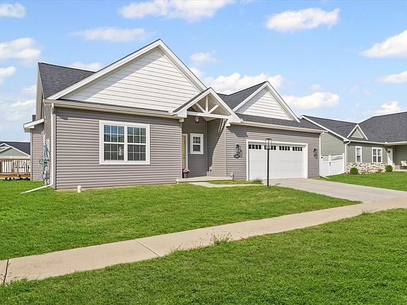 This beautifully maintained ranch home, built just four years ago, offers 2 bedrooms and 2 full bathrooms and showcases an open-concept floor plan that seamlessly connects the living, dining, and kitchen areas. Step inside to find 9-foot ceilings, upgraded finishes, and engineered Norwegian veneer flooring flowing throughout the entire home. The kitchen includes upgraded appliances, quartz countertops, a center island, and a corner pantry for added storage. The living room features sleek Techline cabinetry, complemented by matching built-ins in the second bedroom, currently serving as an office. The primary suite is spacious and inviting, complete with a walk-in closet and an adjoining bath with a step-in shower and dual vanities. The laundry room offers room to add a folding counter for additional convenience and the washer and dryer are just 3 years old. Originally an enclosed porch, the now fully finished bonus room provides a bright and comfortable space perfect for a home office, reading nook, or hobby area, with access to the custom wood deck. Situated just minutes from Meijer, Carle Clinic, Meadowbrook Park, and a variety of restaurants. Make Memory Lane your next home!