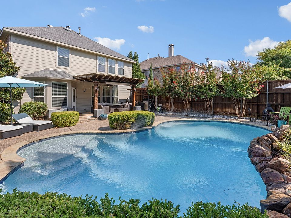 This East-Facing, stunning 3-bedroom, 3-bathroom home in Frisco ISD offers a perfect blend of modern amenities and classic charm, situated in a highly desirable McKinney, TX location. Step inside to discover a meticulously updated interior designed for both daily living and entertaining. The remodeled kitchen is a chef's dream, featuring brand-new Quartzite countertops, appliances, and cabinetry. The spacious living area is equally impressive, with a freshly painted fireplace and staircase that add a touch of elegance and sophistication. The home also includes smart thermostats for effortless climate control and a cell signal booster to ensure strong reception throughout. The space boasts a covered outdoor kitchen area with an outdoor sink. A beautiful pergola and a smaller sitting area and the pool is equipped with a tanning ledge & brand-new Aiper Smart Pool Equipment. Enjoy evenings by the outdoor chimenea on the included green chairs and umbrellas or relax on the poolside chairs and umbrellas. For your storage needs, a convenient outdoor shed is also included. This exceptional property comes with a number of valuable features that provide significant added value and peace of mind. Govee Trim Lights installed (Which are wifi-enabled for any color occasion).The sale includes the kitchen refrigerator, oven, and microwave, as well as a complete set of washer and dryer. The kitchen sink features an integrated cup washer for modern convenience. The home has been meticulously maintained, including a recent foundation repair. A transferrable home warranty is in effect until February 2026. The exterior has been upgraded with a new front flower bed and a stylish new mailbox, creating a welcoming first impression. Located near a brand new Costco & HEB. Walking distance to two beautiful parks. Adjacent to the Apex Center, Library, and tennis, Pickleball Courts. Don't miss your chance to own this exceptional property.