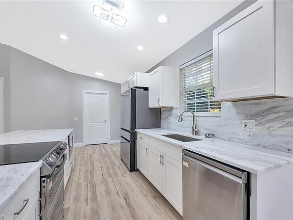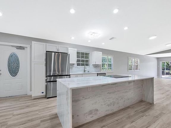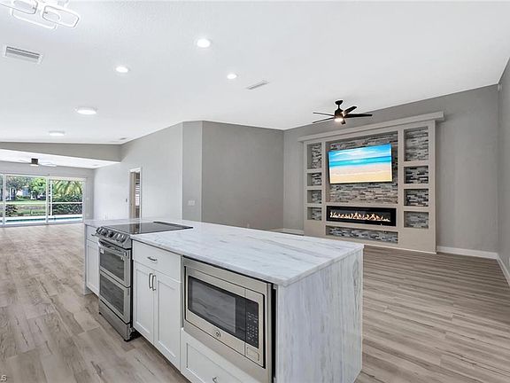 Modern luxury meets resort living in this completely transformed Island Walk residence, with a brand new roof and a host of high-end upgrades that elevate everyday living. Inside, walls have been removed to create a light-filled, open layout that blends style with function. The stunning kitchen serves as the heartbeat of the home and features a striking waterfall-edge island, sleek new cabinetry with modern hardware, new appliances, a built-in pantry, and seamless countertops that extend up the wall for a clean, contemporary look. New wood-style flooring flows throughout, complemented by fresh neutral paint, designer lighting and fixtures for a luxurious yet inviting atmosphere. The living area centers around an electric fireplace—adding warmth and ambiance with the touch of a button. Retreat to the primary suite, where dual vanities with gilded mirrors, luxe metal accents, and custom tile work elevate the spa-like bath. The guest bath mirrors this attention to detail with its own new vanity and eye-catching finishes. Additional upgrades include new washer and dryer, plus a stylish laundry sink/vanity. Outside, the private lanai overlooks a tranquil lake and is framed by lush tropical foliage that provides added privacy to the sparkling pool and outdoor lounge space. Island Walk offers resort-style living at its best, with 7 tennis courts, 4 pickleball courts, bocce, croquet, lawn bowling, a lap pool, resort-style pool, library, fitness center, card rooms, event spaces, and more. Everyday conveniences are just a golf cart ride away, including a post office, gas station, car wash, nail and hair salons, and the on-site Casa Cotzelli restaurant. Move-in ready and masterfully upgraded, this immaculate home offers the lifestyle you’ve been waiting for.