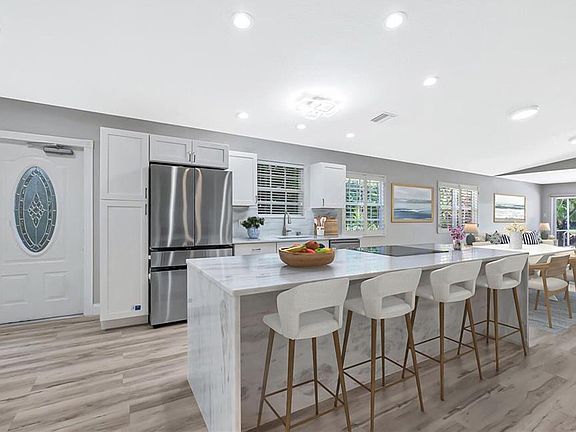 Electric fireplaceSleek new cabinetryWaterfall-edge islandPrivate lanaiLush tropical foliageBuilt-in pantryFresh neutral paint