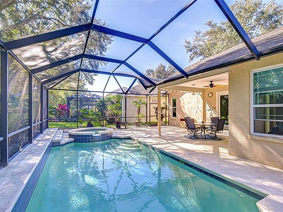 This immaculate, move-in-ready Arvida Laurel model is located on a quiet cul-de-sac in the prestigious River Hills Country Club, one of Hillsborough County's finest gated, golf-course communities. Designed for modern living, this home combines elegance with cutting-edge smart features throughout, including a garage Wi-Fi app, Rachio Rain monitoring irrigation system, and upgraded blinds installed in 2025. The home has been meticulously maintained, with the water heater replaced in 2025, a new water softener added, the air conditioning system replaced within the last two years with ductwork upgraded and replaced in 2025, and pool equipment replaced in 2023 with Wi-Fi connectivity for control from anywhere. Exterior improvements include gutters added around the pool in 2024 with warranty protection and in-ground backyard lighting that beautifully illuminates the yard and pool area. Inside, the bedrooms feature beautiful heritage hardwood floors installed in 2020, while the great room and master bedroom have new sliders installed in 2021, complementing the windows that were fully replaced that year. The open floor plan includes dining and living areas, a bright kitchen with breakfast nook, laundry room, three bedrooms, and two full baths. Living spaces are light and airy with 9-foot ceilings, plant ledges, and Saltillo terra cotta tile flooring in all wet and traffic areas. The updated kitchen offers ample cabinet and counter space, granite countertops with stainless under-mount double sink, pantry, breakfast bar, and stainless appliances, including side-by-side refrigerator, ceramic-top range, dishwasher, and built-in microwave oven. The spacious master suite features a 12'x7' walk-through walk-in closet, while the master bath boasts dual vanities with Carrera marble countertops, a soaking tub, and a separate glass-enclosed step-in shower. A 14'x13' covered lanai overlooks the 36'x31' screened pool and spa, and now includes a convenient electric awning with built-in lights, providing extra space for relaxing or entertaining outdoors. With exceptional curb appeal highlighted by a stacked stone exterior and mature landscaping, this home shows obvious pride of ownership and thoughtful upgrades throughout. River Hills offers residents tree-lined streets, playgrounds, walking trails, basketball and volleyball courts, an 18-hole golf course, Jr. Olympic pool, eight Har-Tru tennis courts, a fitness center, dining room, sports bar, and pro shops. Conveniently located near shopping, dining, outdoor recreation, top-rated schools, and just a short drive to Downtown Tampa, MacDill AFB, airports, Florida’s theme parks, and Gulf Beaches, this home perfectly blends luxury, comfort, and modern smart living.