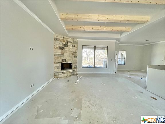 This Bush plan is a 3BR/2.5BA with a study and formal dining, 2-car garage, and 2355 sqft. Features include crown molding, high ceilings with wood beams, wood-look ceramic tile floors in the main areas, custom soft-close cabinets and drawers, indoor and outdoor fireplace, ceiling fans, formal and informal dining, cooktop and built-in oven/microwave, granite countertops, outdoor kitchen, and landscaping package with sod, flower bed, and automatic sprinkler system. Estimated completion April/May.