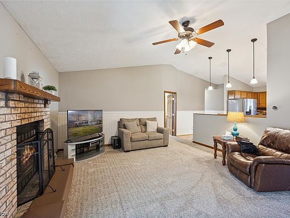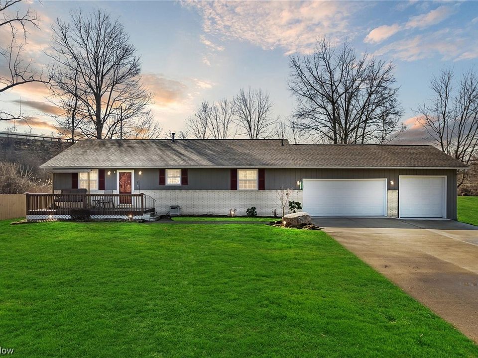Home Sweet Home! This exceptional 3 bedroom, 2 bath ranch is situated on a beautiful 0.70 acre lot! Country living with city conveniences. Quick commute to 480, turnpike, NR schools, and shopping/dining. Charming front porch overlooks the front yard. Ideal, open floor plan on main floor w/ vaulted ceilings in the kitchen and living room. Interior has been freshly painted and has newer carpeting (2021) and attractive hard surface flooring. Spacious living room boasts a cozy brick wood-burning fireplace. Off the living room is a large enclosed porch that overlooks the backyard. 2 generous size bedrooms and a full bath off foyer. In addition, a lovely primary suite featuring 2 closets and ensuite full bath with upgraded shower (2019). Convenient first floor laundry. Sprawling full basement offers tons of storage space and awesome rec room! The fully fenced in backyard is a dream ~ full of possibilities! Ample shed w/ water and 220. Let's not forget the 3 car attached garage! 3rd garage ha