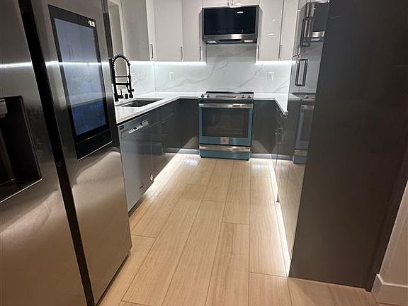 Gourmet Kitchen A true showpiece featuring a full suite of high-end stainless steel appliances and smart refrigerator, sleek European-style high-gloss cabinetry, elegant quartz counters and backsplash, and mood-setting under-cabinet LED lighting.