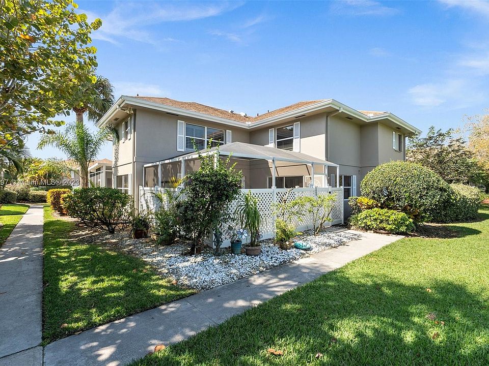 Tranquil lake views! Updated kitchen with custom lighting, range with double oven and beautiful cabinets and counter-tops. The downstairs has large tile laid on a diagonal, plantation shutters, updated half bath and a private screened in courtyard. This home has two Master bedrooms each with its own bath. One of the bedrooms has a murphy style bed and custom shelving in the closet which lends itself to many options. Located in a desireable school district, this community has a manned security gate, two pools, tennis & handball courts, basketball, toddler play area and is conveniently located near shops & restaurants. Easy access to I-95 and the Fl. Turnpike. Property line does not extend to lake, sizes are approx. Cannot lease first two years.