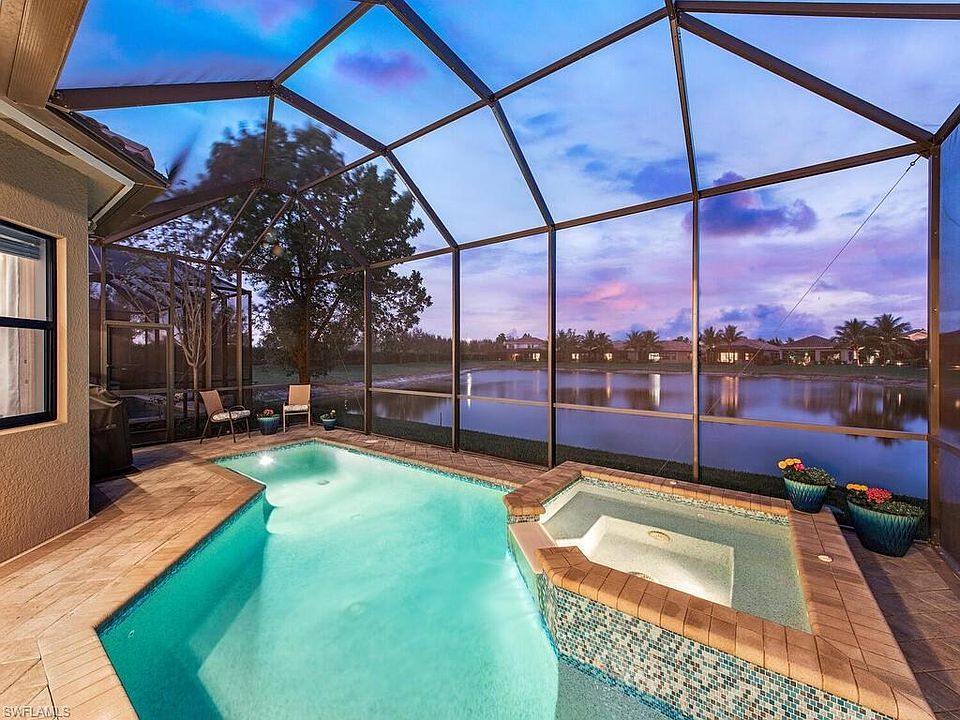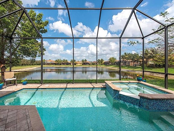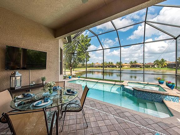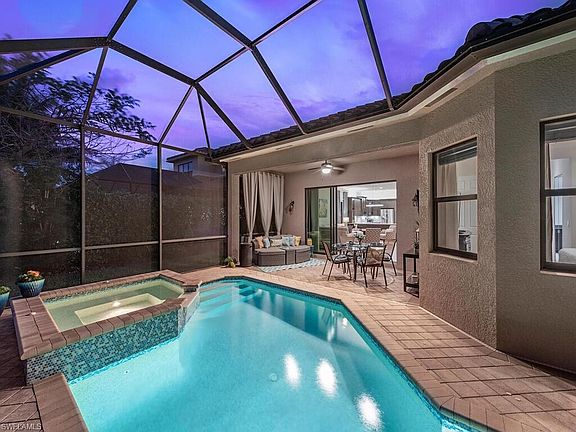 Feel like you're on vacation every day in this meticulously maintained, tastefully appointed home. Experience the ultimate of Naples outdoor lifestyle while you comfortably dine alfresco in the screened lanai, cool off in your private saltwater pool, soak in your relaxing spa, all while enjoying a tranquil long lake view. Home chefs will love the spacious model view gourmet kitchen with upgraded appliances including induction cooktop, level VII cabinetry with task and ambient lighting, quartz counters and glass backsplash. Working from home is a pleasure in the light-filled den. Enjoy spa-like baths with level IV cabinetry, quartz counters, upgraded fixtures & mirrors to ceilings. Additional features include 12x24 alabaster tile laid on the diagonal, designer lighting, dimmers, ceiling fans, great room bump-out detail, crown molding, orange peel finish walls, & window treatments. Efficient 16 SEER A/C system. Easy storm prep with impact windows & doors throughout. Riverstone offers a social, vacation-inspired lifestyle including fitness facilities, social hall, resort & lap pools, spa, 5 Har-Tru tennis courts, basketball & pickleball courts, tot lot & full-time activities director.
