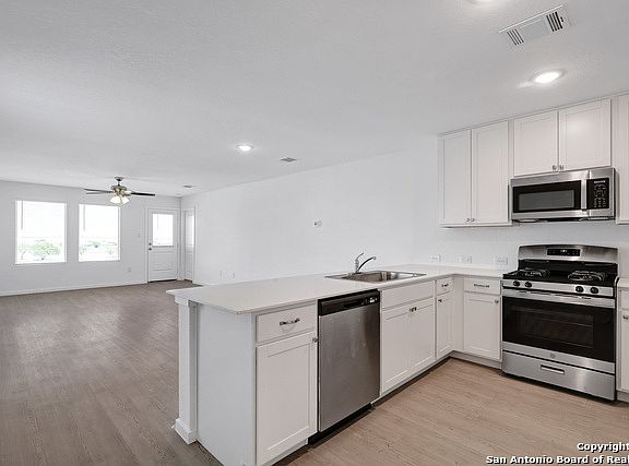 Welcome to this stunning new residence in the desirable Voss Farms community. Designed with open-concept living in mind, the home features luxury vinyl flooring throughout the main living areas for both style and durability. The kitchen stands out with its expansive peninsula, providing abundant space for cooking and entertaining. The primary suite offers a true retreat, complete with a ceiling fan for added comfort and a well-appointed en suite bath. Step outside to discover what makes this property unique-tranquil views of fields, trees, and open nature with no rear neighbors. Residents of Voss Farms enjoy access to community amenities including a pool and playground. Situated in New Braunfels, this location places you near vibrant attractions such as Schlitterbahn Water Park, Fisher Park, Landa Park, the Historic Gruene District, and more.
