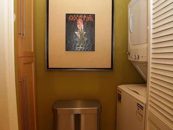 The home features numerous upgrades, including a gourmet kitchen, a spacious bedroom with a walk-in closet, an open-concept living and dining area, an in-unit laundry room with washer and dryer, and a private balcony perfect for relaxing outdoors.