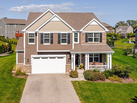 Wonderful home with five bedrooms and a laundry room on the second floor. Upgraded flooring throughout: wood floor on the first floor and carpet on the second floor. Open concept kitchen with modern white cabinets and granite countertops. Tall ceilings on main floor and basement. Basement includes rough in for a future bathroom. Safety features include upgraded conduit wiring and fire suppression system. Beautiful landscape with a post construction upgrade of the patio and grill station. Garage includes floor coating and paneling. Close to interstate, Gurnee Mills, Six Flags, parks and shopping.