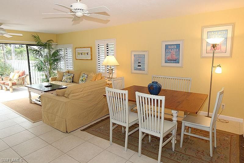Guests will enjoy this Lovely, cheerful and colorful property only 2 blocks to 5th Ave. S. in Old Naples. Walk to the beach (3 blocks) and walk to all the restaurants, shops and galleries for which Old Naples is famous! All this is possible and still enjoy reasonable rent. The living room offers a sofa and loveseat, TV, and sliding glass doors leading to a large patio with cushioned furniture for your outdoor seating with additional table for dining. There is an expandable wood table in the living area which opens to accommodate 6. In addition, there is a kitchen table and 4 chairs. The flooring is tile throughout the condo in keeping with the beach atmosphere. The kitchen is sizable and very well equipped and completely updated. The master bedroom offers a king bed, large closet, chair and TV plus its own bathroom with shower. The guest bedroom has twin beds, a closet and TV and the hallway bathroom with shower is next to the guest bedroom. There is a washer and d