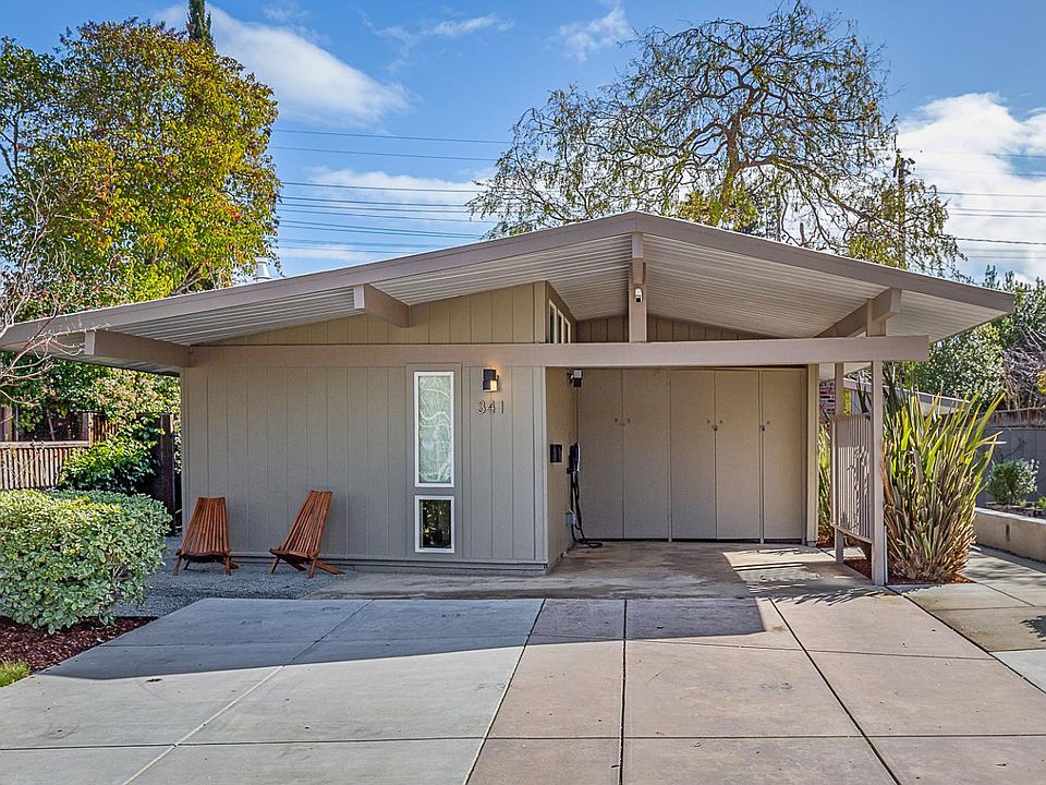 Boasting classic Eichler design, this home features numerous skylights, a designer color palette, gorgeous hardwood floors, and thoughtful modern upgrades. From the freshly painted exterior, to the open-concept living and entertaining spaces, to the verdant backyard, every space is stylish and move-in ready. The living and dining areas enjoy floor-to-ceiling, custom dual pane windows overlooking the yard, and connect directly to the open chefs kitchen with vast polished concrete countertops, abundant cabinetry, and high-end appliances. Three bedrooms sit privately on one side of the home including the spacious primary with a luxe en suite bath. Outside, you have a lovely garden area with four raised beds and a wraparound yard with stretches of synthetic lawn, a large concrete entertaining patio, a fire pit patio with built-in bench seating, a mature shade tree, and prolific perimeter landscaping. Located in a desirable neighborhood just steps from Robles Park and with easy access to nearby amenities, commute routes, and acclaimed Palo Alto schools.