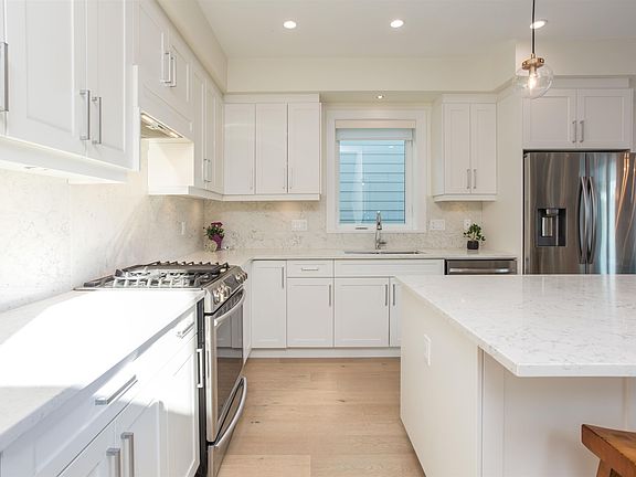 Nestled between the urban conveniences of Central Lonsdale and the serenity of Ray Perrault Park and Grand Boulevard, this custom-built half duplex offers the best of both worlds. Spanning two levels, it features soaring ceilings, hardwood floors, A/C, a cozy fireplace, and an expansive crawl space. The bright kitchen with large island, stone counters, and high-end appliances flows seamlessly into the sunlit dining and living areas. Upstairs, the private primary suite includes a partial skyline view, while two additional bedrooms complete the traditional family layout. Enjoy outdoor living on the south-facing deck or in the fully fenced yard. With lane access to a detached garage and a prime walkable location, this is the perfect family home—without strata fees or restrictions!