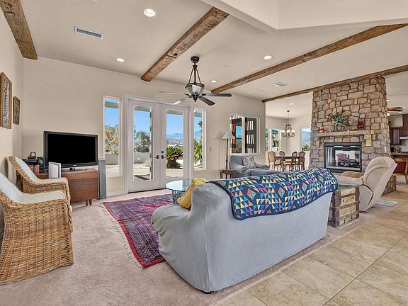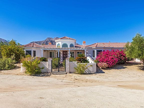 Beautiful 2565 SF custom built home with luxury amenities has one of the best residential streets in Borrego nestled up to Indian Head mountain. No HOA. 3BR 2.5 BA, 2 car attached garage higher than usual, walled back patio area with fire pit, formal entry from walled front courtyard. 10' ceilings, 8' doors, propane fireplaces 1 in master BR + 2 sided in LR and FR. New solar window screens, 2 new water heaters, Monogram built-in fridge and propane stove, Bosch dishwasher and kitchen pantry. Laundry room. Total of 5 acres on 2 parcels with water meter. Excellent mountain and desert views! 2 HVAC systems with WIFI apps that can be controlled remotely. 2565 SF home. Landscaping on automatic watering. Laundry room near kitchen pantry. Jacuzzi tub in master bathroom. Additional Lot 141-382-25-00 is included in the asking price. Borrego Springs is one of only a handful of International Dark Sky Communities in the world. Borrego Springs is located in the low desert unincorporated area of northeastern San Diego County. Borrego Springs is a winter resort destination and we welcome the "snow birds" who arrive from colder climates to warm up during the winter. Borrego Springs is less than a 2 hour drive from San Diego or Palm Springs. Borrego Springs is a village within a park, completely surrounded and protected by the Anza-Borrego Desert State Park, is the largest desert state park in the contiguous United States with over 660,000 acres. This desert community is miles away from the nearest stoplight and we have no big box or chain stores. The slower uncomplicated pace and the scenic beauty, add to your rustic, authentic, desert experience. It is a special place, in all seasons. Activities include, nature walks, off-roading, hiking, biking, watching the wildlife, photography or star gazing. Borrego Springs is an active community for young and old alike with a desirable small town atmosphere. The elevation of the Borrego Valley Airport is approximately 520'.