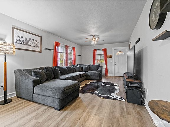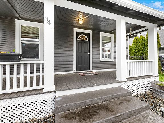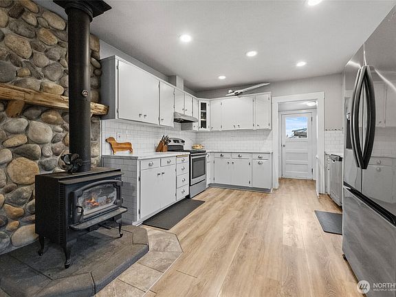 Carbonado charmer with original character intact & thoughtful updates throughout. Inviting covered country porch, newer roof & peek-a-boo mountain view welcome you in. Open concept floor plan is filled w/natural light from updated vinyl windows. Cozy wood burning stove w/river rock surround & cedar slab mantel—plus a large woodshed piled with wood that stays! Gleaming vinyl flooring, crisp white molding & updated light fixtures throughout. Kitchen features new fridge, SS appliances, extensive subway tile backsplash & tastefully painted cabinets. Mudroom opens to fully fenced backyard w/alley access, room for extra parking & spacious outbuilding w/power. Move-in ready w/washer & dryer included. Unfinished second story offers room to expand!