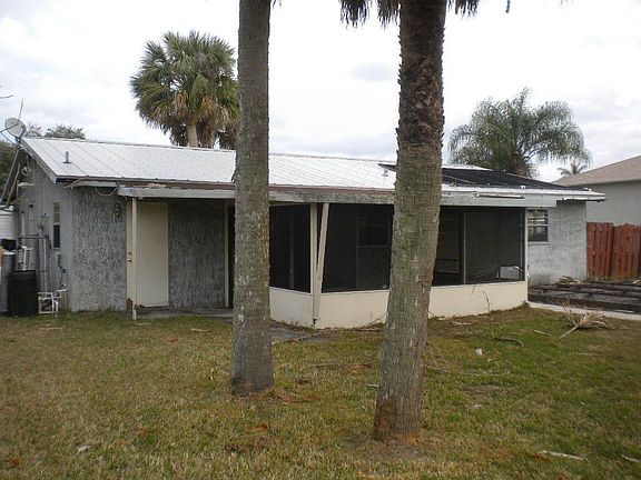 Exterior Features: This is a block stucco Solar Pool Home with a Metal Roof, concrete slab foundation and all windows are intact. The eaves are damaged around the corner of the converted garage which has new drywall. The home does have a covered poarch 10x 15 on the back of the home, seperate from the pool, and fenced yard. Interior Features: The living room has hardwood floors and a mirrored wall, with ceiling fan and white walls. The kitchen is yellow and has many cabinets all in good shape. Master bedroom has no flooring but does have blinds on the windows, the second bedroom has newer carpet and light green walls. Bathrooms are smaller and yellow, and the second bath does not have a sink. There is a small refrigerator newer stove and dishwasher, also there is a hot water heater and water softener. The pool pump and AC unit is NOT present