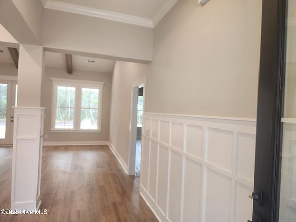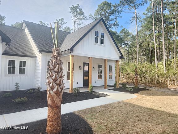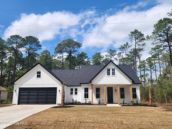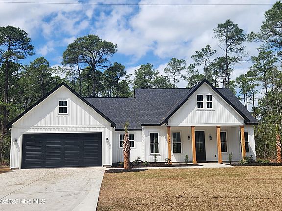 New Modern farm house style new construction custom designed home with 3 bedrooms and 2 baths located in Carolina Shores North. When entering the home, you are welcomed by the large foyer which features custom wainscotting and crown molding. Adjacent to the foyer is the dining area which also includes crown molding and wainscotting. The kitchen offers quartz countertops, farm sink, oversized island, and stainless appliances, including, dishwasher, microwave, and range. The all-wood cabinetry comes with easy close doors and drawers. There is a huge pantry off of the kitchen that could also be used for an office/hobby room. The living area has custom trim, ample room for entertaining and opens to a huge covered back porch. The master bedroom offers a trey ceiling with crown molding and a large walk-in closet. The master bath comes with dual vanities, quartz countertops, and custom tile shower. Master closet has builtin wood shelving.There is a large laundry room with built in cabinets and quartz countertops. This home has 9' walls with 6' windows, not the standard 8' walls with 5' windows. The home features an oversized 8'x18' garage door, along with gutters. The hot water heater is located in a closet inside the garage with extra room for storage.