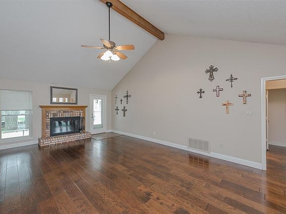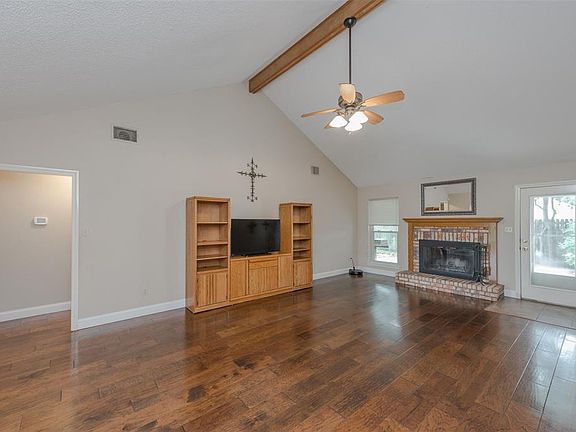 Spacious brick one story tucked into an established neighborhood in highly sought after Highland Village with its award winning Marcus high school. Step into a welcoming open living room with high ceilings, gorgeous wood floors, and beautiful brick wood burning fireplace. Split bedrooms, over-sized master bedroom w-spacious master bath, double sinks and endless counter space, huge walk-in closet, new triple pane, high efficiency windows, newer HVAC system, Storm Safe Shelter, a lush yard, established trees, and large patio provides plenty of room and shade for outside entertaining. Walking distance of DoubleTree Ranch park, within minutes of I-35, shopping, DFW airport and Lake Lewisville parks.