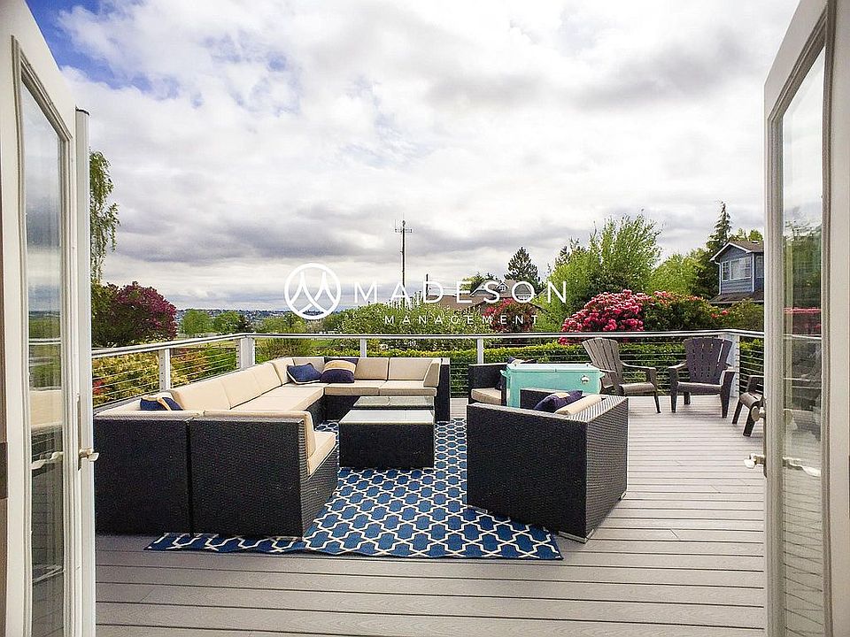 Rare opportunity: Old world charm and character, high ceilings, both staircases have landings, great protected view of Cascade Mtns, very large fenced yard, sun from sunrise to sunset, dog park one block away, close to Discovery Park and Magnolia Village & Metropolitan Market. Great opportunity to own full-size Magnolia home. 600 sq. ft. deck off living rm makes for great entertaining, BBQ's and breakfasts. Watch the sun come up from the over the Cascade Mtns from the 7 person hot tub with bluetooth speakers.