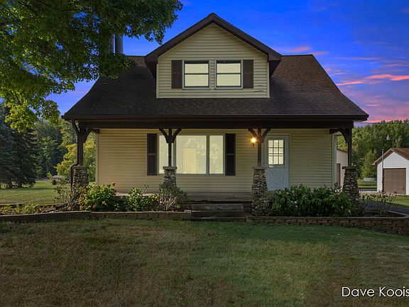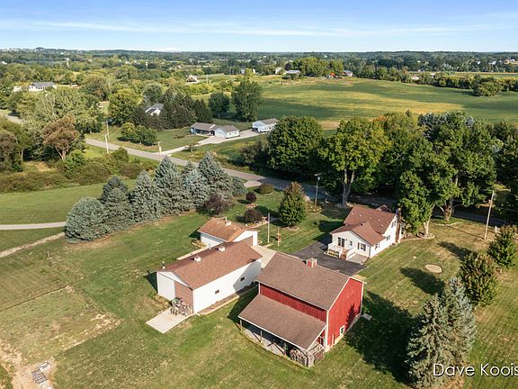 This property has it all with several outbuildings, 5+ acres, a pond, and its location in the Blue-Ribbon Byron Center school district makes it an excellent opportunity for a hobby farm or home business. The detached oversized 2 stall garage is insulated and heated, and there is also a 30x50 pole barn that is insulated and heated with 220 power, cement floors, and 10- and 12-foot doors. The big red hay barn is in incredible shape with a newer roof, solid structure, and fresh exterior paint, while the full-size lower level is ideal for storage or livestock and features a covered lean-to running the full length. The house itself is very well built and solid, perfectly functional but ready for some cosmetic updates, with an 8-year-old roof, brand new water heater, zero-maintenance deck, and some replacement windows. The comfortable floor plan includes a large kitchen with new stainless-steel appliances that remain with the home, a dining room with a sliding glass door to the deck, a big wall of windows for natural light, and a living room with additional windows and a brick wood-burning fireplace. The main floor hosts one bedroom and a huge full bathroom, while the other three bedrooms are upstairs. The unfinished lower level offers great laundry and storage space, plus a couple of partition walls for an office or workshop area. Outside, the front porch with stone pillars is a shaded spot to relax, complemented by mature landscaping and a gardening area. This is truly one of the coolest pieces of real estate around and a real value for this much quality land, plus all the buildings, vacant with immediate occupancy. COME SEE IT TODAY!